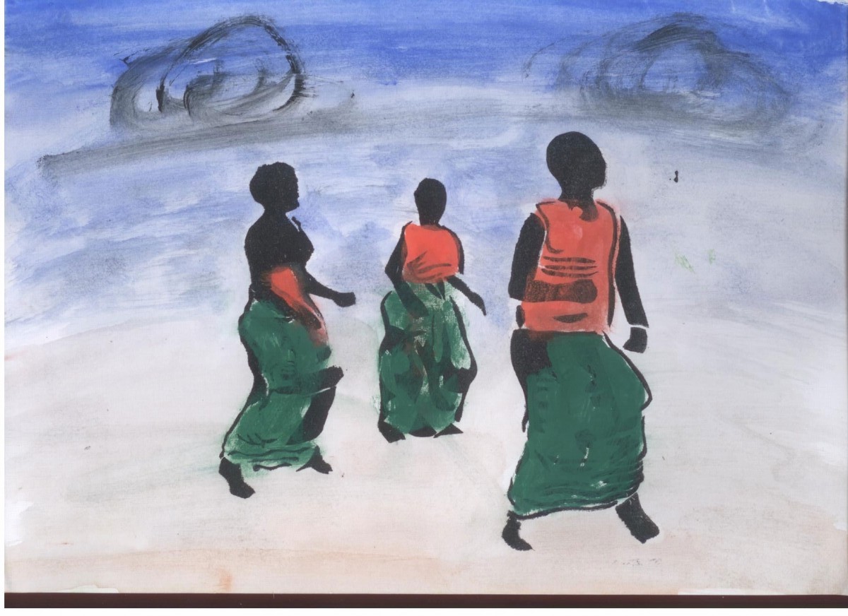 Three women dancing with storm clouds.