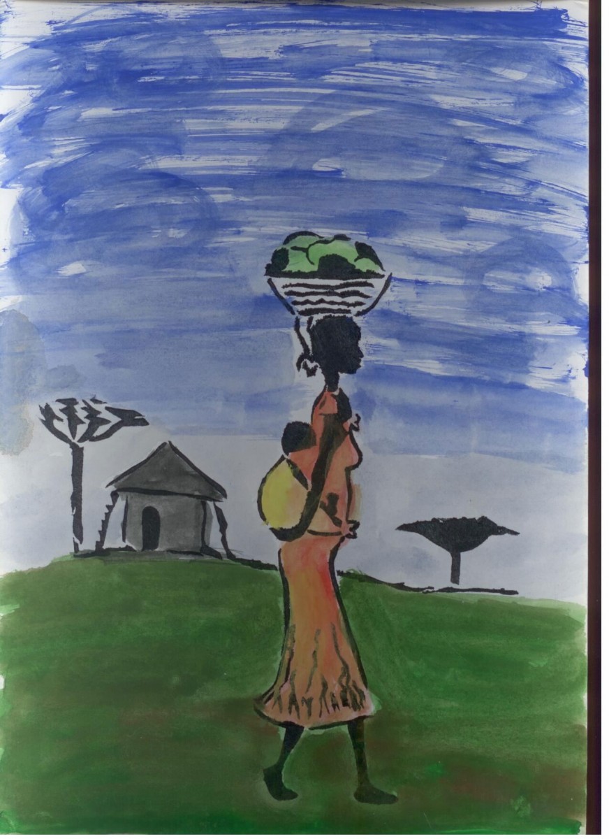Woman carrying food on head, baby on back.