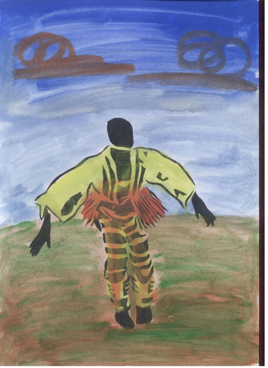 Man dancing in ceremonial garb with storm clouds in the sky.