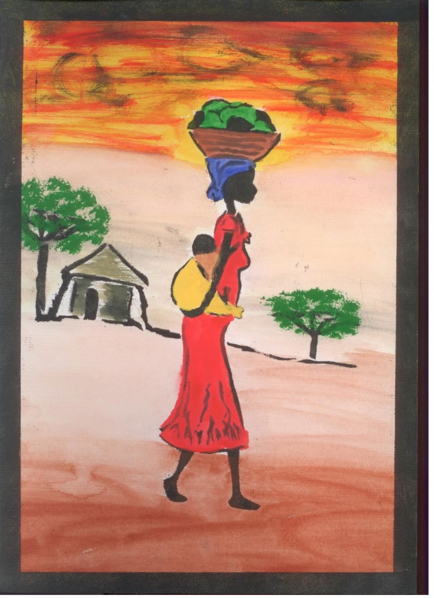 Woman carrying food on her head, a baby on her back, on a sunny day with storm clouds.