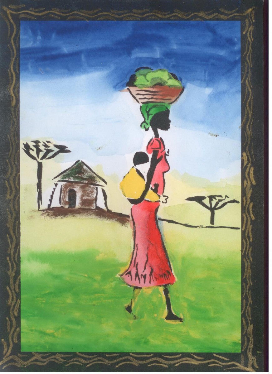Woman carrying food on her head and a baby on her back.