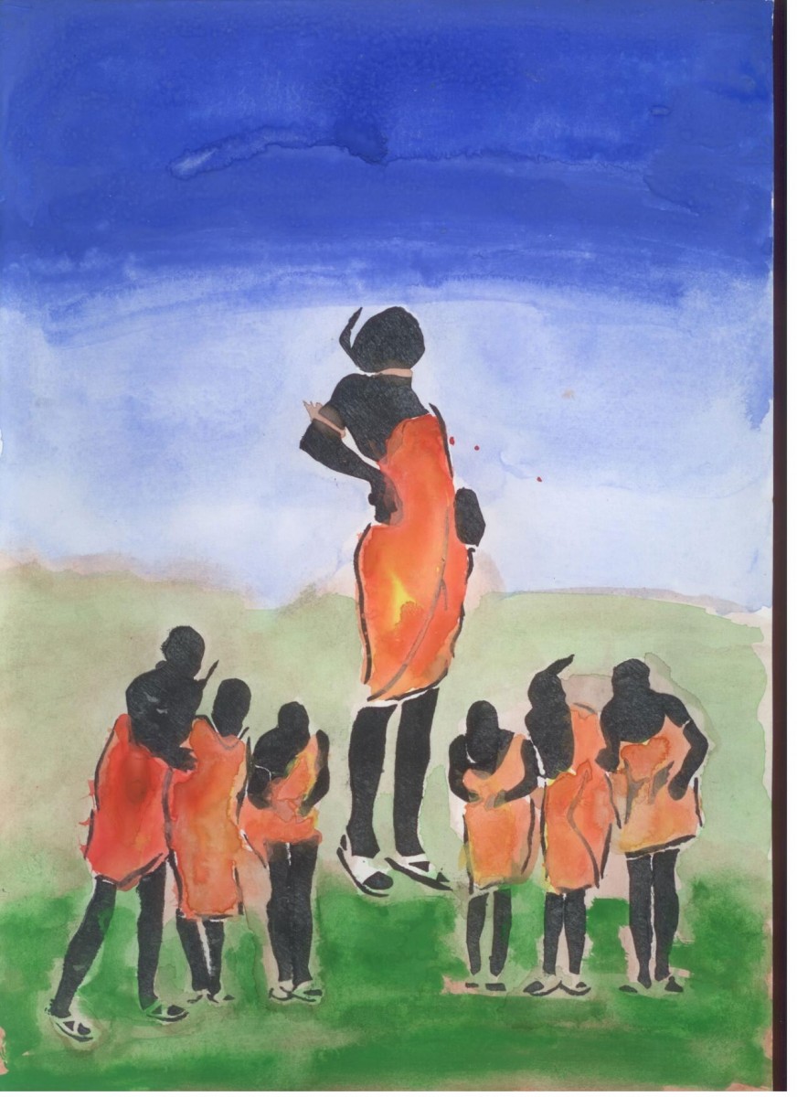 7 women dancing with one of them jumping high in the air, a bright blue sky above her.