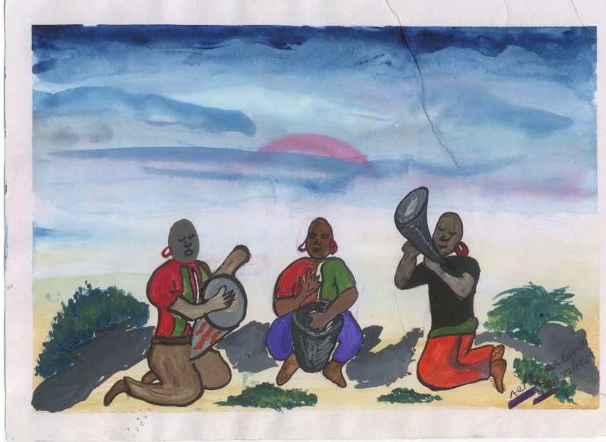 Three women playing musical instruments.